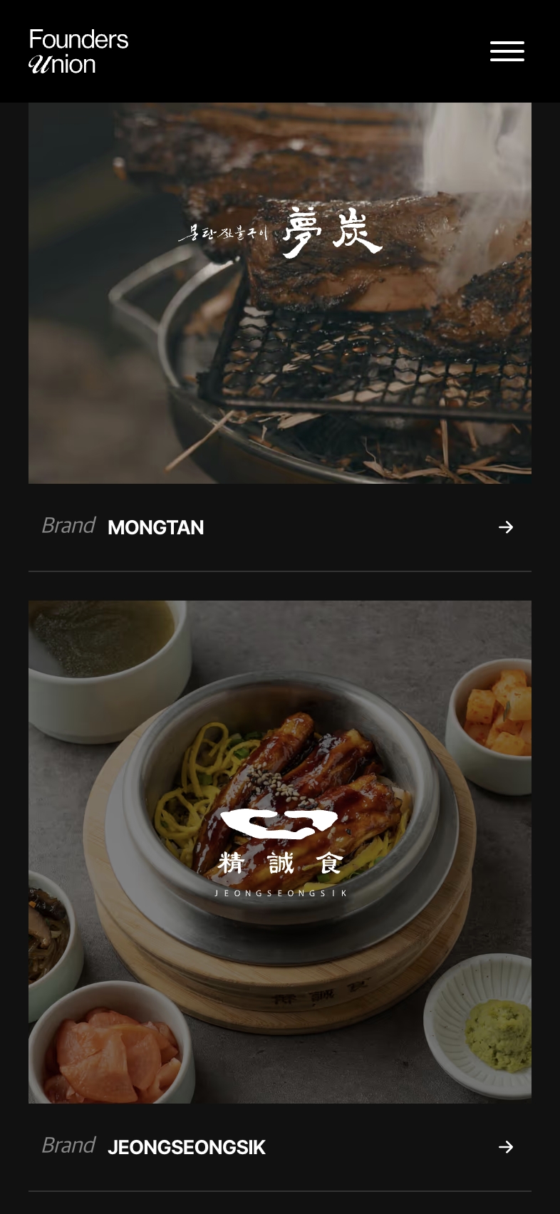 Brand 페이지에서는 몽탄, 정성식, 리틀넥 각 브랜드의 스토리와 정체성을 개별적으로 소개하는 구조로 설계하여, 브랜드별 독립적인 아이덴티티를 유지하면서도 Founders Union의 포트폴리오로서 통일감 있게 표현했습니다.