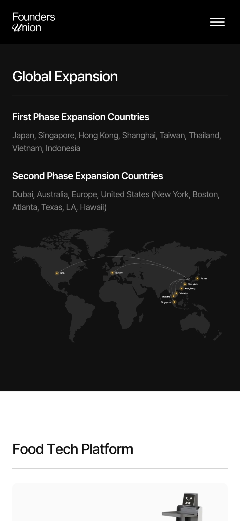 Founders Union은 몽탄, 정성식, 리틀넥 등 국내 유명 F&B 브랜드를 글로벌 시장에 진출시키는 외식 투자·운영 기업의 공식 웹사이트입니다. 한국에서 검증된 브랜드를 일본, 싱가포르, 홍콩, 미국 등 주요 도시의 대표 K-Food 브랜드로 포지셔닝한다는 기업 비전을 웹사이트 전반에 담아냈습니다. 어둡고 절제된 블랙 톤의 프리미엄 디자인으로 고급 외식 브랜드를 보유한 기업의 품격과 신뢰감을 표현했습니다.